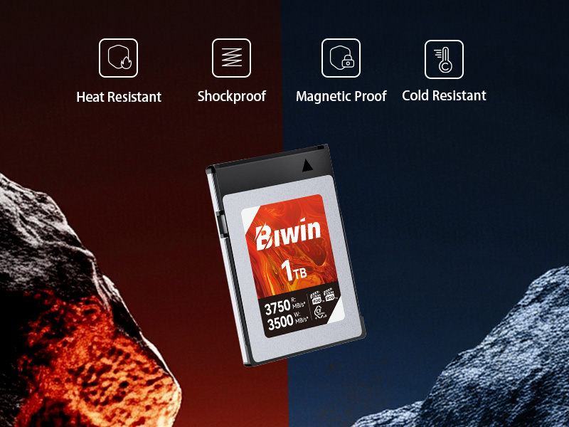 Biwin Amber CB500 CFexpress™ 4.0 Type B memory card is built for professional grade 12K video capture with read speeds up to 3750 MB/s and write speeds up to 3500 MB/s. Its advanced heat dissipation supports long-duration shoots without interruption. With durability against extreme temperatures, impacts, and environmental challenges, this card brings reliable performance despite even the worst conditions.
