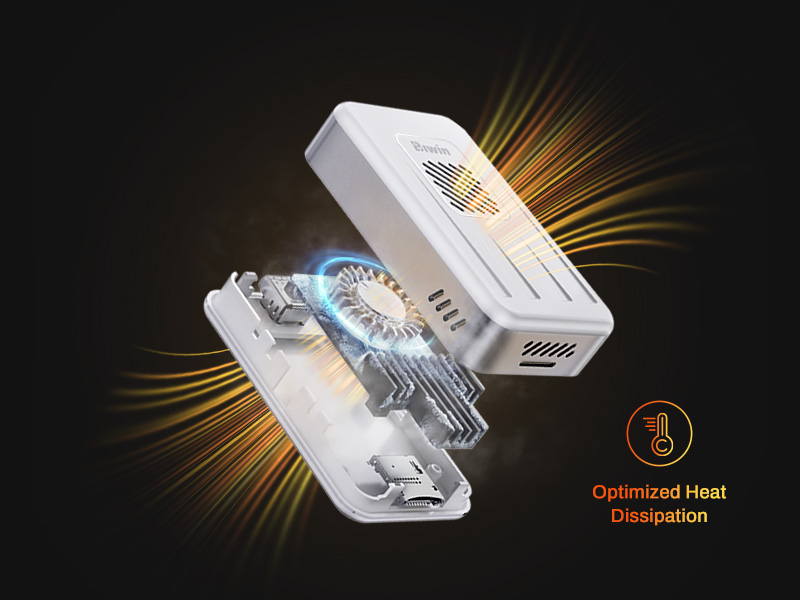 The Amber RE310 integrates a built-in cooling fan to improve heat dissipation efficiency and to ensure consistent performance even for lengthy file transfers by up to 60%*. Where passive microSD card readers can suffer from thermal throttling, Biwin’s lab-tested* cooling solution helps the Amber RE310 microSD Express card reader deliver reliable performance.