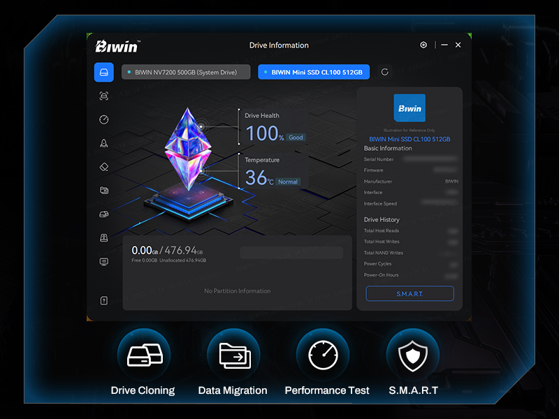 Biwin CL100 is supported by Biwin Intelligence, a management software developed to maintain stable performance and data integrity over time. For a more convenient and more secure storage experience, this software helps users manage their drives with features like performance test, data migration, firmware update, and more. Seamlessly update, test, and manage your storage devices with ease with Biwin Intelligence.